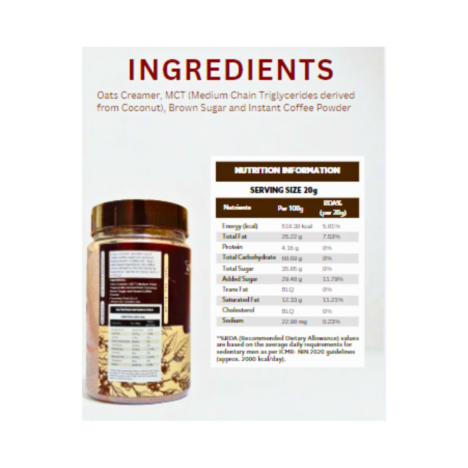 Oats Creamer, MCT (Medium Chain Glycerides derived from Coconut), Brown Sugar and Instant Coffee Powder.