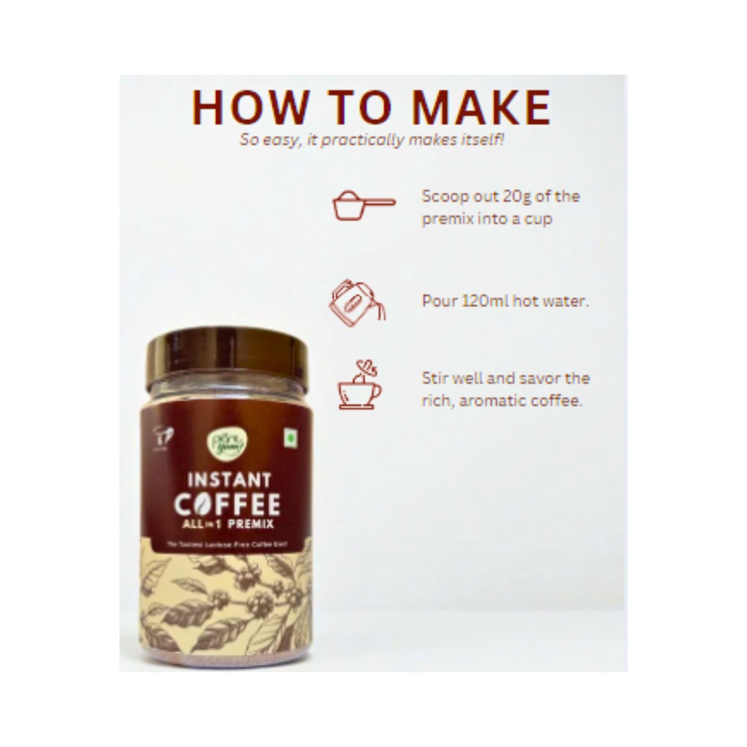 Made with love for busy mornings and mindful living, our Plant Yum Instant Coffee Premix comes in 5 flavours and is a dairy-free, all-in-one blend of premium coffee, plant-based milk, and just the right sweetness. No extra ingredients needed—just add hot water and enjoy a smooth, creamy cup anytime, anywhere. Net wt - 160 gm per jar - Serves 8 (20g per serving).