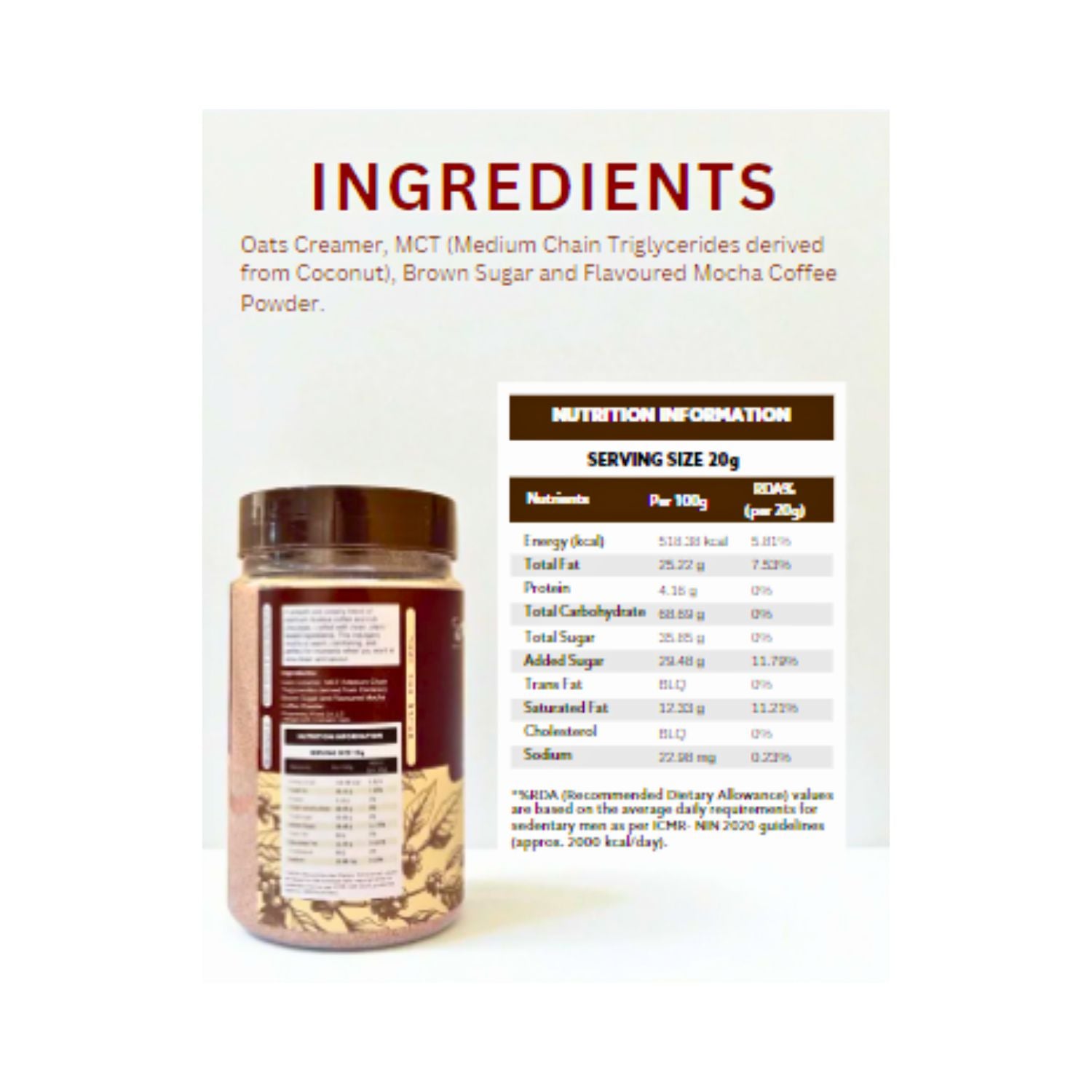 Oats Creamer, MCT (Medium Chain Glycerides derived from Coconut), Brown Sugar and Mocha Coffee Powder.
