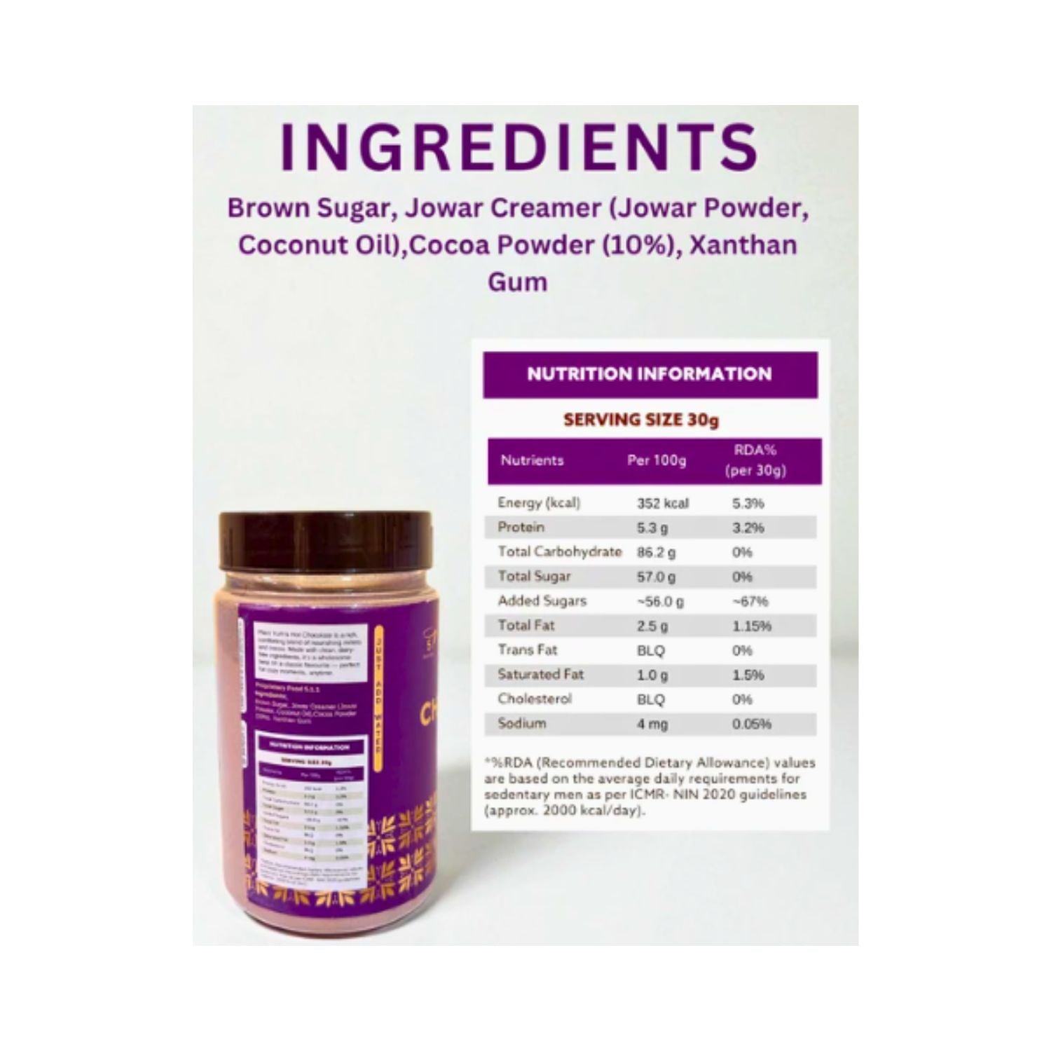 Experience pure comfort in a cup with Hot Chocolate Premix, a rich, velvety blend for chocolate lovers who crave wellness and flavour in every sip. Crafted with premium cocoa and thoughtfully chosen plant-based ingredients, this instant hot chocolate is deliciously soothing and good for you, with no artificial flavours or dairy. Just add hot water for a creamy, decadent drink that’s free from refined sugars and unnecessary junk. 180g (6 servings)