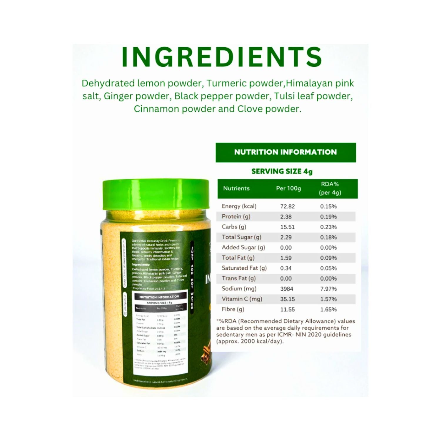 100g serving provides 72.82kcal of energy, 2.38g of protein, 15.51g of carbohydrates, 2.29g of total sugar with no added sugar, 1.59g of total fat including 0.34g of saturated fat and 0g trans fat, 3984mg of sodium, 35.15mg of vitamin C, and 11.55g of fibre.