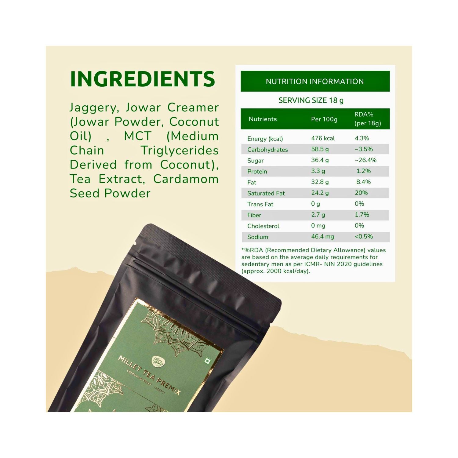 Jaggery, Jowar Creamer (Jowar powder, Coconut oil), MCT (Medium Chain Triglycerides derived from coconut), Tea Extract, Cardamom seed Powder.